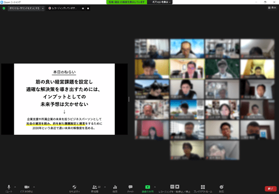 筋の良い経営課題を出して、最適な解を見出していくために、未来予想は欠かせない。 未来の解像度を高め、準備しておくことが大切です。今回のワークショップでは、参加者全員で2030年の未来を考えました。参加者は、総勢25名でした。