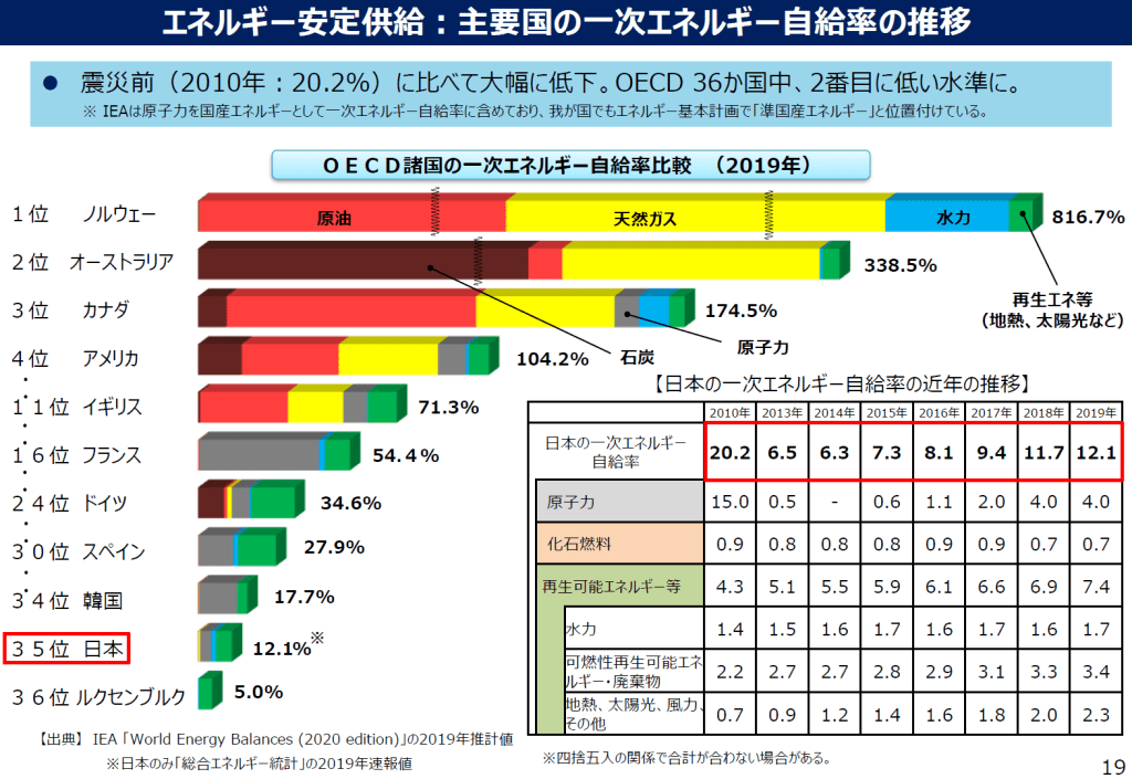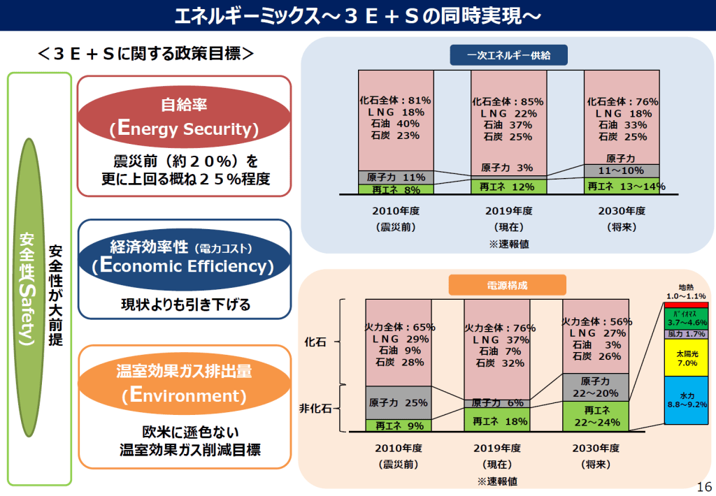 エネルギーミックスの基本的な考え方である、3E+Sの考え方について、解説して頂きました。脱炭素というと、CO2排出量に注目してしまいますが、我々の生活を支えているエネルギーですから、安全性や経済性、自給率も大切ですね。あと、エネルギーの自給率が、日本は先進国で35位なんですね。皆さん、驚いていました。