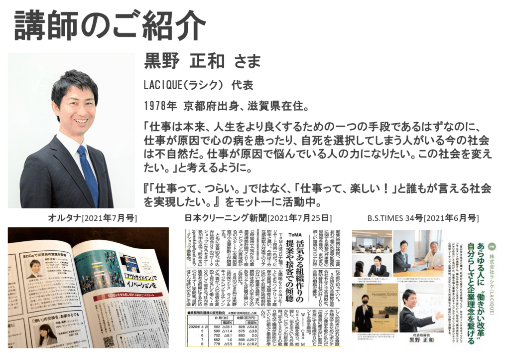 今日で13回目の定例会です。今回はウェルビーイングとSDGsを組み合わた研修で高い人気を誇る、株式会社ラシク 代表取締役の黒野正和さまを講師にお迎えして、研修の内容や手ごたえ等についてお話しいただきました。