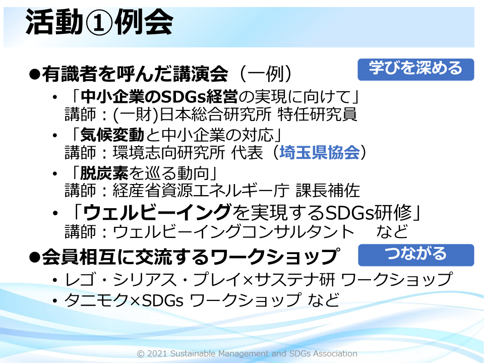 活動内容では、有識者を呼んだ例会や、会員相互の理解を深めるワーク等を通じて、研さんを行っています。活動の中で、埼玉県中小企業診断協会(埼玉県協会)のSDGs共創経営研究会さまとも接点ができました。