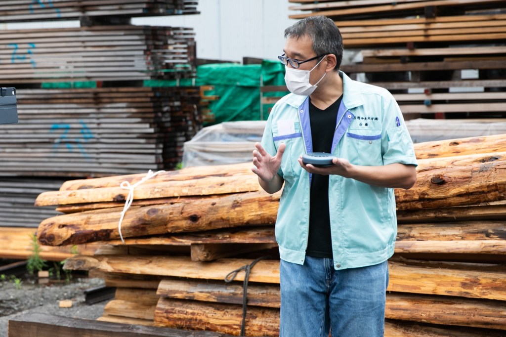 広い敷地内に膨大な数の木材が保管されている光景に、一同ワクワクが止まりません! しかし、それでも少ない時期とのことでした。吉野では、木の成長時期に合わせて、7月~1月に伐採するそうです。さらに伐採後、すぐ運び出すのではなく、木から水分を蒸発させるためにしばらく放置しておきます。これによって、色がきれいになる上に、軽くなって運びやすくなるとのことでした。