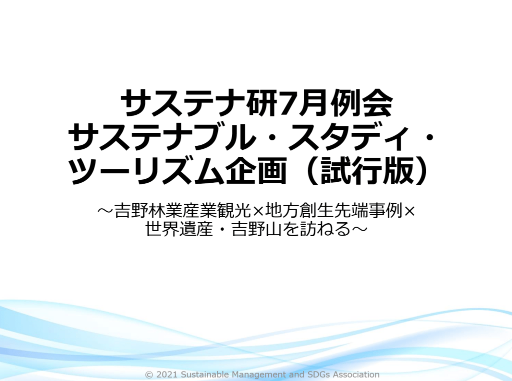 2022年7月16日、第23回定例会をハイブリッドで開催しました。「サステナブル・スタディ・ツーリズム(試行版)」と題して、特徴的なお取組をされている木材関連産業2社(吉野中央木材株式会社さま(奈良県吉野町)、株式会社徳田銘木さま(奈良県黒滝村))から、持続可能な社会づくりや企業について学ぶことができました。