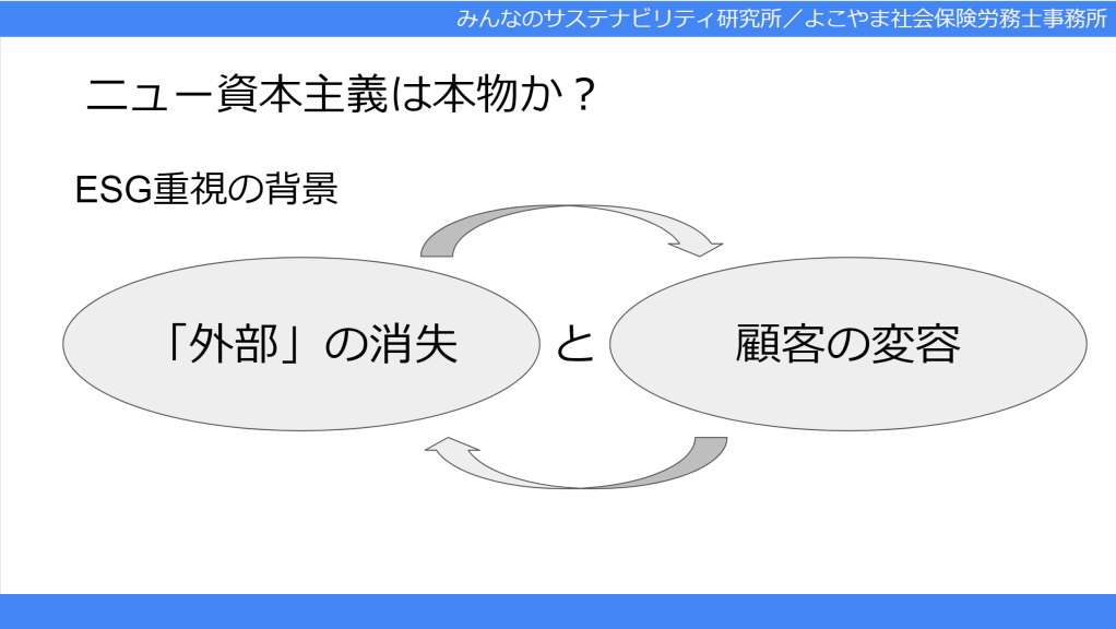 イントロとして、横山さんからESG経営についての説明が行われました。普段何気なく使っている「ESG」のアルファベット3文字ですが、この文字の順番にも意味があるんじゃないか。という視点は新しい気づきになりました。