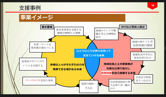 具体的な支援内容のご報告を鹿島さんから説明いただきました。お三方がパートナーとして関わった事業者は垂水重機さまです。