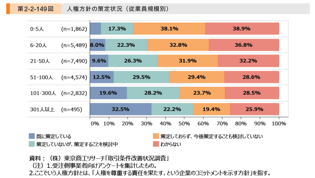 同様に人権方針の策定状況を見ると、301人以上の企業でも3割にとどまり、50人以下では1割にも満たない状況であることがわかります。