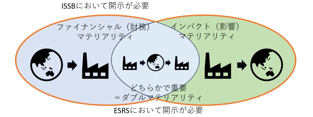 ちなみに、財務影響のみを開示上重要(マテリアル)とする考え方をシングルマテリアリティ、環境や社会への影響もまた重要(マテリアル)とする考え方をダブルマテリアリティといい、ISSBは前者の考えを、ESRSは後者の考え方を取っています。