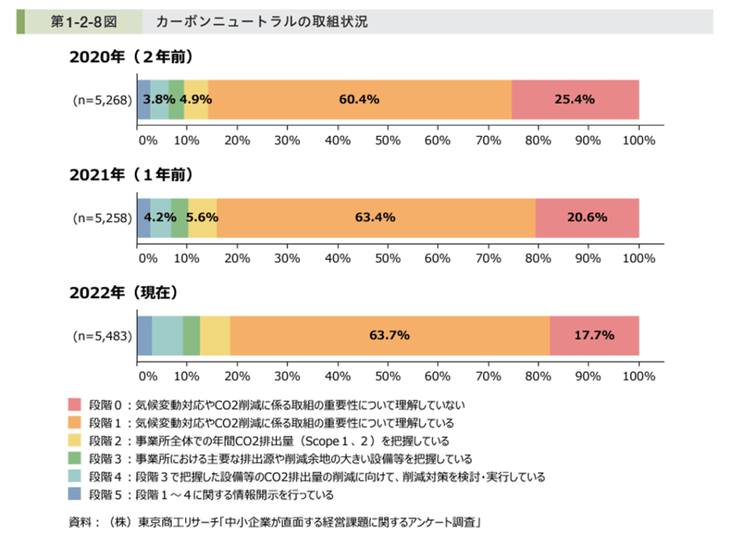 ここから、中小企業の対応について掘り下げて検討します。東京商工リサーチ「中小企業が直面する経営課題に関するアンケート調査」によれば、2022年現在、気候変動の取組について「重要性について理解していない」と回答したのは17.7%であり、8割以上は気候変動の取組の重要性を理解していると思われます。一方で、事業所全体でのCO2排出量(Scope1,2)を把握していると回答した企業は全体の2割にも満たない状況です。