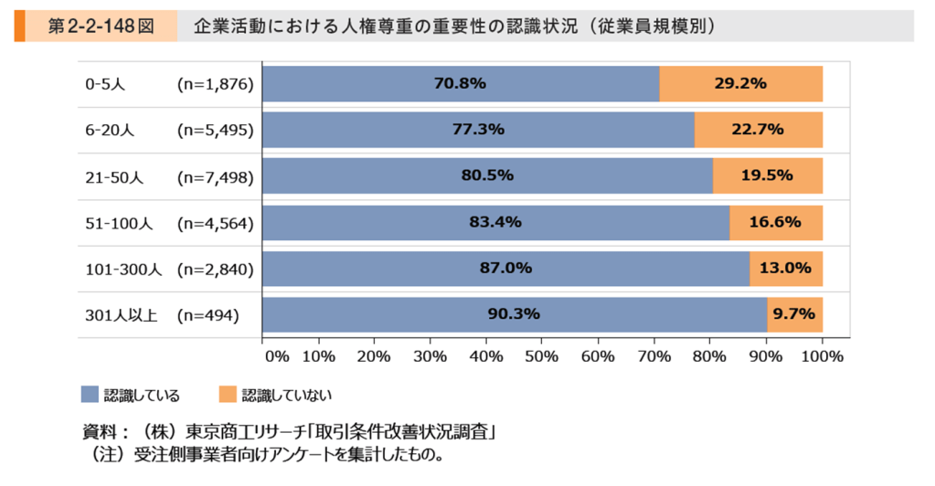 東京商工リサーチ「取引条件改善状況調査」によれば、従業員規模別に中小企業の人権尊重の重要性の認識状況を見ると、最も低い5人以下でも7割は重要性を認識しています。