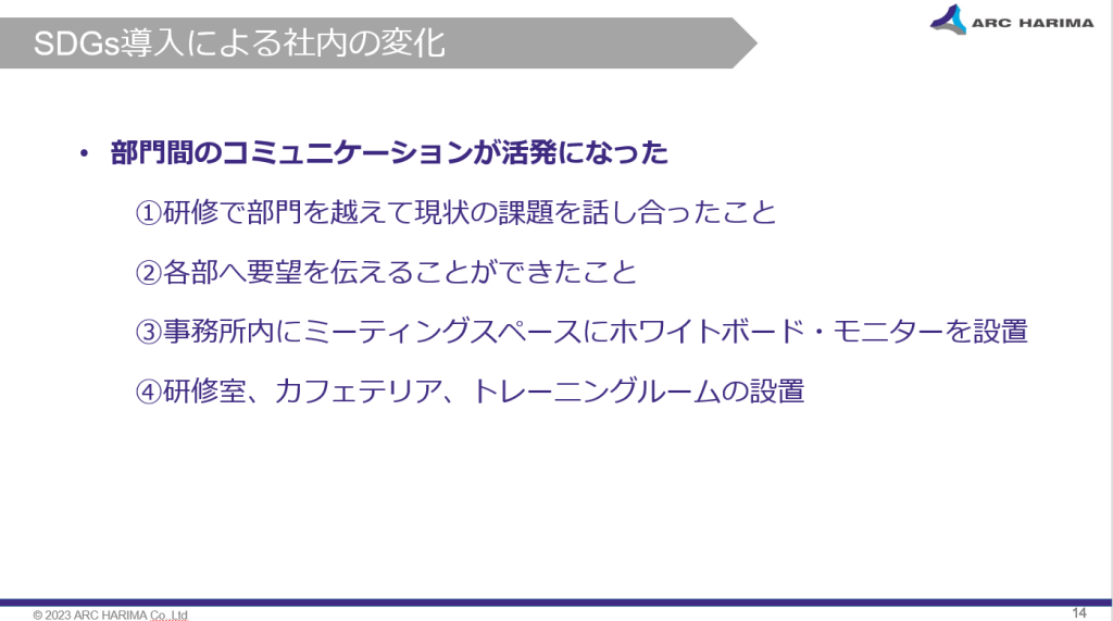 全体の研修を通じて、自分たちの仕事がどのように社会課題に貢献し得るか理解が深まった、これまで以上に部門間でのコミュニケーションの活性化につながった。この2つの評価は支援にも関わったメンバーとして光栄に思います。