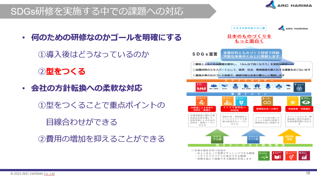経営管理のスタッフとしての課題として、研修後にもSDGsの考え方が風化しないように腐心している、とのこと。