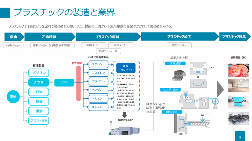 原油から石油精製、プラスチック原料、加工、製造に至るまで、複数の企業が関わり、私たちの手元にプラスチック製品が届きます。