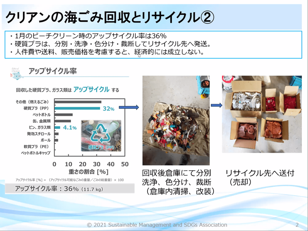 1月に回収した海ごみのアップサイクル率は36%。アップサイクルの引受先も増えてはきているようですが、まだまだのようで回収・分別・洗浄などのコストを考慮すると経済的には成立できないとのこと。