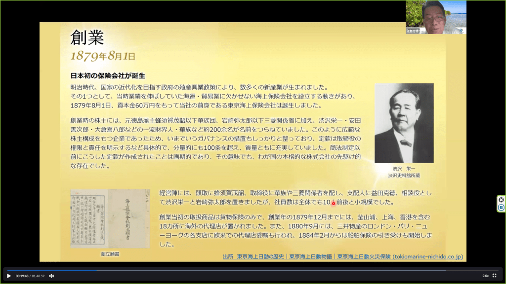 第50回の定例会はオンラインでの開催です。研究会メンバーで保険業界を長く経験されている江島さんから「損害保険から見たレジリエンスとSDGs」というテーマでお話しいただきました。