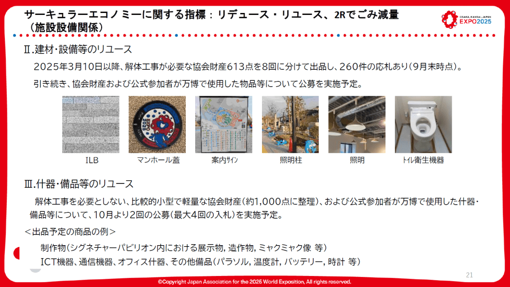 会期後の課題として、施設設備のリユースの取り組みが重要視されています。大屋根リングの一部(約200m)を残すことになったほか、万博サーキュラーマーケット「ミャク市!」を立ち上げ、シグネチャーパビリオンの設備や建材、什器・備品などの公募・入札を行いました。